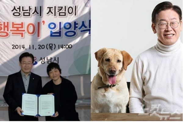 이재명 경기도지사와 성남시장 재임시 입양한 유기견 '행복이'.(사진=이 지사 인스타그램 및 자료사진)