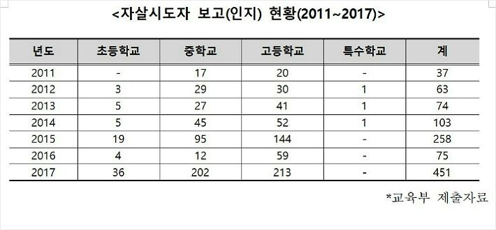 지난해 자살을 시도했던 것으로 보고된 학생은 총 451명이며, 이 중 6명은 같은 해 재시도를 한 것으로 조사됐다.