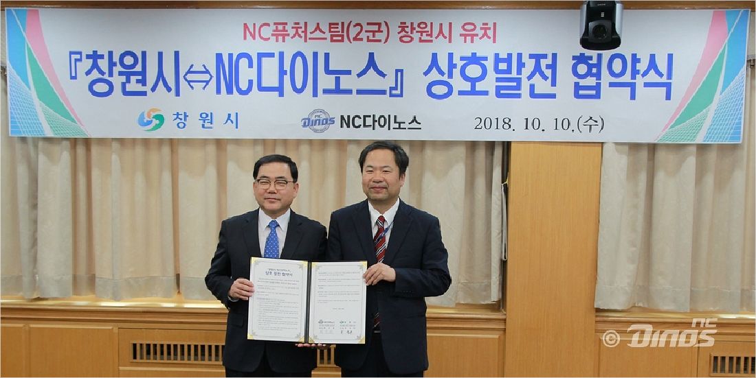 NC는 10일 창원시와 퓨처스팀의 창원 이전을 내용으로 하는 업무협약을 시청에서 진행했다. 이 자리에는 허성무 창원시장과 NC 황순현 대표 등 10여 명이 참석했다.