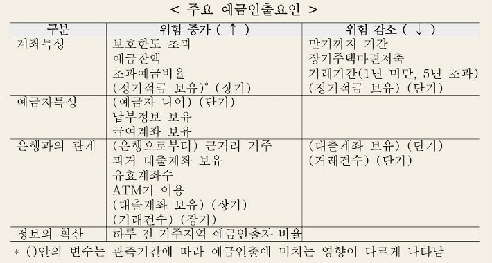 이런 가운데 예금자와 은행의 거리, 예금상품의 특성 등도 예금인출 위험에 영향을 미치는 요인으로 나타났다. 예금자 거주지가 저축은행과 가까울수록 인출위험이 높았고, 예금에 세제혜택이 있거나 잔여 만기가 길수록 인출위험이 낮았다는 것이다.
