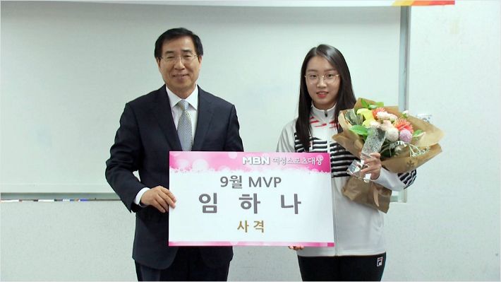 임하나는 10일 서울시 중구 퇴계로 매경미디어센터에서 열린 2018 MBN여성스포츠대상 9월 시상식에 참석해 상금과 상패를 받았다.