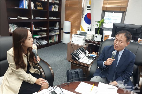 강원CBS박윤경 아나운서가 춘천시청 시장실에서 이재수 춘천시장과 인터뷰를 갖고있다.(사진=강원CBS)