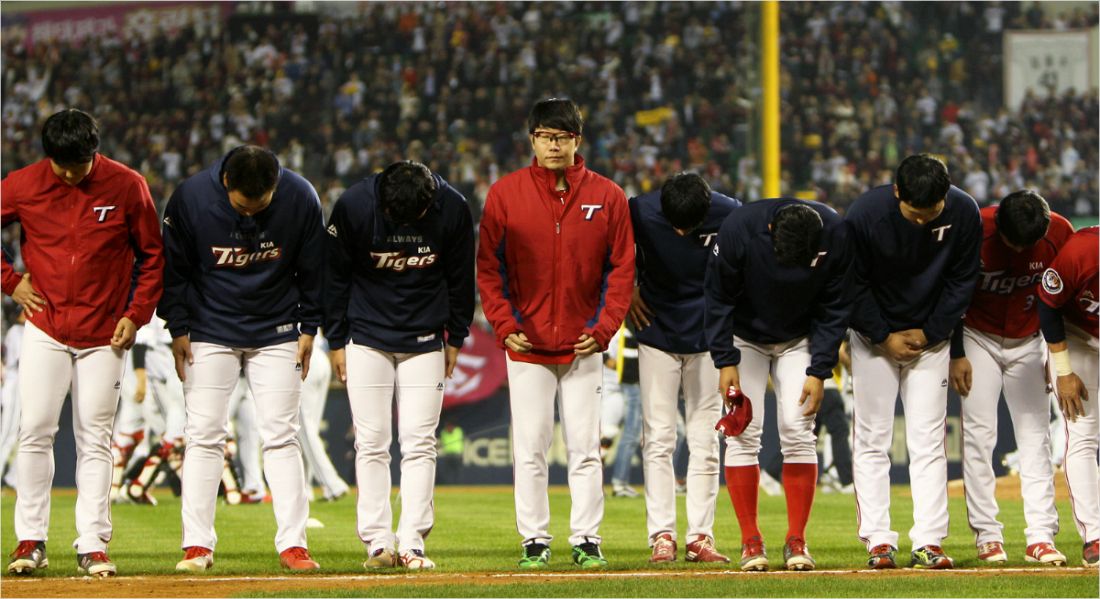 KIA 선수들이 2016년 LG와 와일드카드 결정 2차전에서 아쉬운 패배를 안은 뒤 팬들에게 인사를 하는 모습.(사진=KIA)