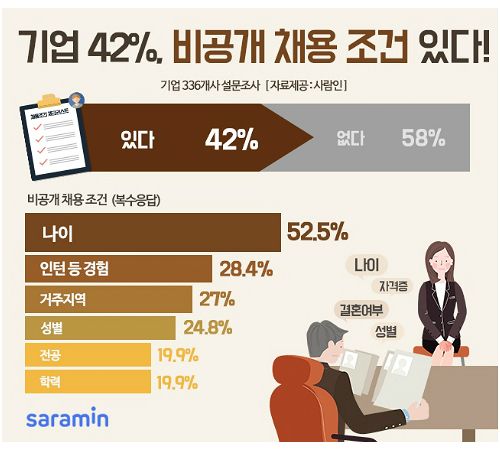 구인구직 매칭플랫폼 사람인은 기업 336개사를 대상으로 조사한 결과 42%가 ‘비공개 자격조건이 있다’라고 답했다고 16일 밝혔다.