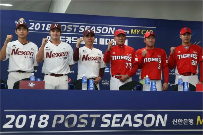 넥센과 KIA 감독과 선수들이 15일 와일드카드 결정전 미디어데이에서 필승을 다짐하는 모습.(사진=넥센)