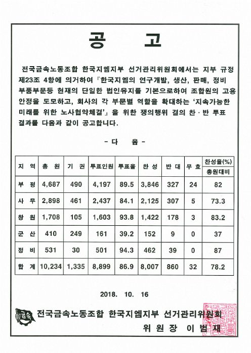 전국금속노동조합 한국GM지부는 16일, 조합원을 대상으로 이틀간 진행한 투표에서 투표권이 있는 전체 조합원 가운데 78.2%가 쟁의행위에 찬성했다고 밝혔다.
