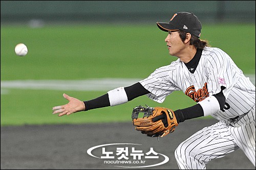 [BestNocut_R]8일 오후 부산 사직야구장에서 열린 2008 삼성 PAVV 프로야구 준플레이오프 롯데 자이언츠와 삼성 라이언즈의 1차전 경기에서 3회 초 1사 후 주자 1,2루, 삼성 진갑용의 기습안타에 롯데 유격수 박기혁이 맨손으로 볼을 잡으려하고 있다.