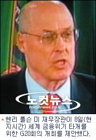 헨리 폴슨 미 재무장관은 8일(현지시간) 전 세계 금융위기를 타개하기 위해 G20회의(G8 선진국+신흥 12개국 재무장관,중앙은행 총재회의)를 개최하자고 제안했다.