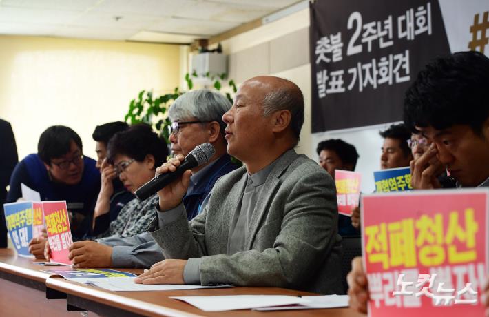 24일 오후 서울 중구 민주노총 교육원에서 열린 ‘박근혜 퇴진촛불 2주년 기념대회 발표 기자회견’ 참석자들이 발언을 하고 있다. 박근혜 퇴진촛불 2주년 조직위원회는 오는 27일 오후 5시 30분 광화문광장에서 2주년 기념대회를 개최한다고 밝혔다.