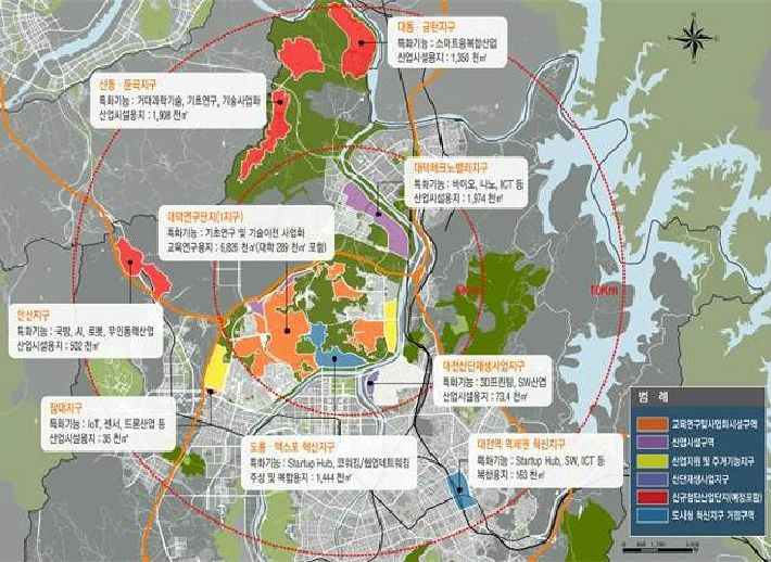대전 대덕연구개발 특구를 핵심지구로 하며 산업단지와 과학벨트, 대전역세권 일원 등을 포함한 반경 10㎞가 국가혁신클러스터 지구로 지정되면서 대전시가 특화 육성 계획을 1일 밝혔다.
