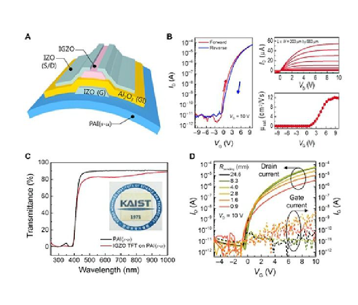 연구팀은 새로 합성된 투명 폴리아마이드이미드 필름 위에 이그조 박막 트랜지스터(IGZO TFT)소자를 제작해 필름을 반경 1mm까지 접어도 소자가 정상적으로 작동되는 것을 확인했다.