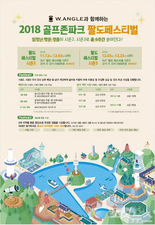 시즌2는 11월 12일부터 12월 2일까지 총 3주간 개최되며 참여를 원하면 전국 골프존파크 매장을 방문해 회원 로그인을 한 후 GLF(Golfzon Live Festival)에서 '팔도 페스티벌 시즌2'를 선택하고 18홀 라운드를 완료하면 된다.