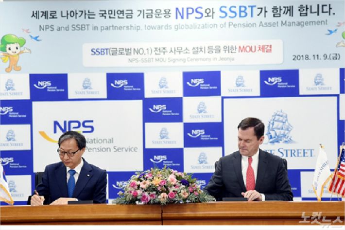 국민연금관리공단과 국민연금 해외자산 수탁기관 중 한 곳인 미국 스테이트 스트리트 은행(State Street Bank and Trust Company) 이 9일 전북혁신도시내 국민연금공단본부에서 업무협약을 체결했다.