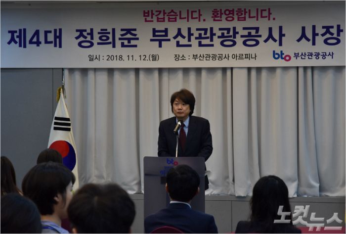 정희준 부산관광공사 신임 사장이 연단에서 취임 소감을 말하고 있다 (사진 = 부산관광공사 제공)