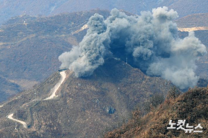 9·19 군사합의서에 따라 남북이 DMZ 내 GP(감시초소) 철거를 시작한 가운데 15일 군 당국이 폭파공법을 적용해 철원지역 중부전선에 위치한 GP를 철거하고 있다. (사진공동취재단)