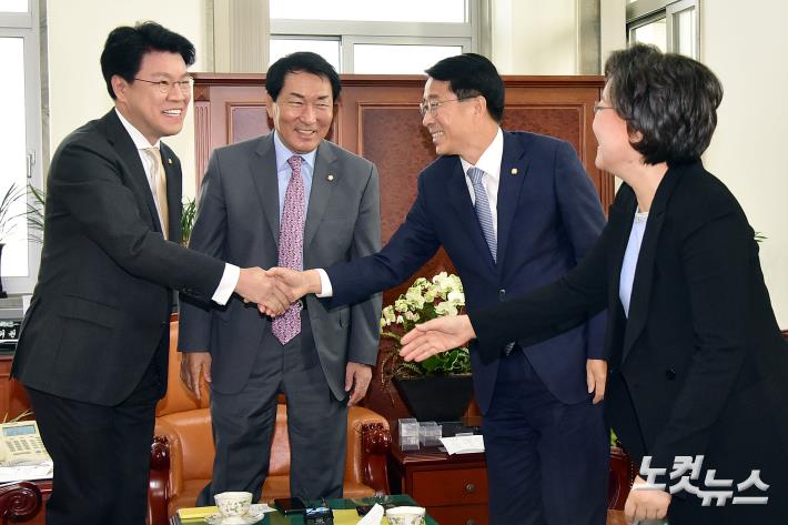 안상수 예결위원장과 여야 예결위 간사가 19일 오전 국회 예결위원장실에서 회동을 갖고 있다. (좌측부터 자유한국당 장제원 간사, 안상수 예결위원장, 더불어민주당 조정식 간사, 바른미래당 이혜훈 간사)