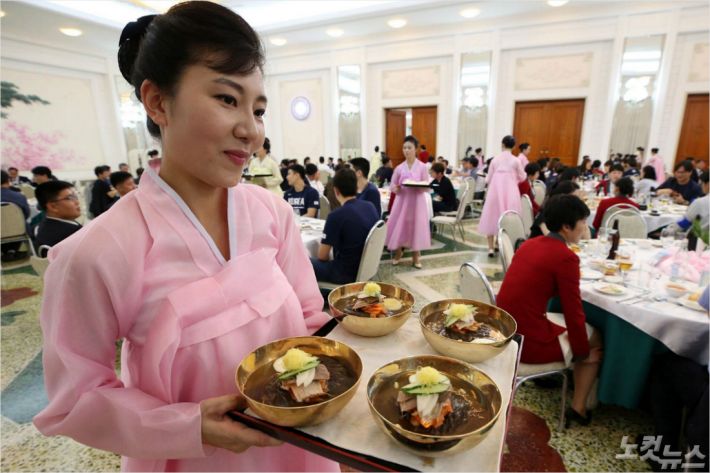 지난 7월 평양 옥류관에서 열린 남북통일농구경기 환영만찬에서 봉사원들이 평양냉면을 준비하고 있다. <사진=자료 사진>사진=자료>