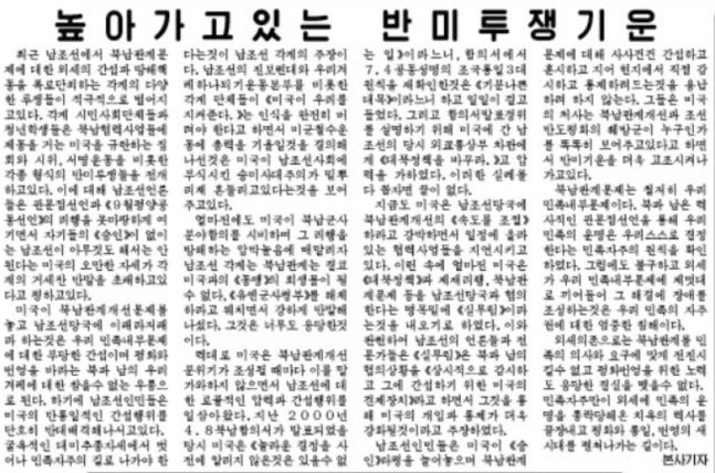 북한 노동당 기관지 노동신문은 19일 '높아가고 있는 반미투쟁기운'이라는 제목의 기사를 통해 "미국이 북남관계 개선문제를 놓고 남조선당국에 이래라 저래라 하는것은 우리 민족내부문제에 대한 부당한 간섭이며 평화와 번영을 바라는 북과 남의 우리 겨레에 대한 참을 수 없는 우롱"이라고 비난했다.