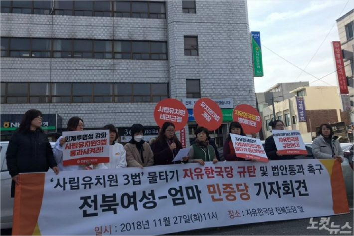 민중당 전북도당 여성 당원들은 27일 자유한국당 전북도당 앞에서 기자회견을 열고 자유한국당의 물타기 중단과 사립유치원 3법의 국회 통과를 촉구했다.