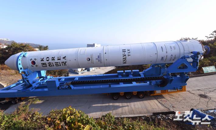 한국형발사체 '누리호'의 시험발사체가 27일 전남 고흥 나로우주센터 발사대로 이송되고 있다. 시험발사체는 오는 28일 오후에 발사될 예정이다.(한국항공우주연구원 제공)