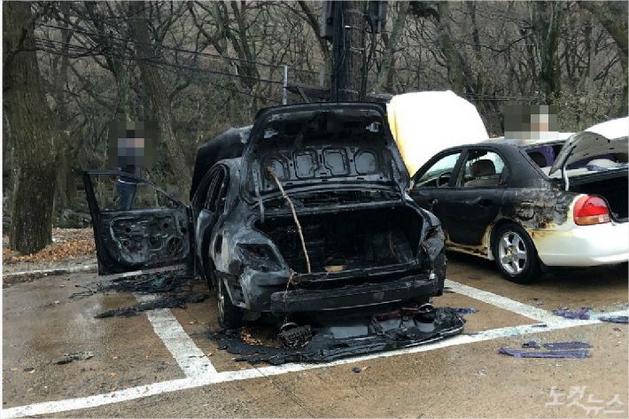 부산 범어사 주차장에 세워둔 차에서 불이 나 1명이 경상을 입고 2천만원 상당의 재산피해가 났다. (사진=부산경찰청 제공)