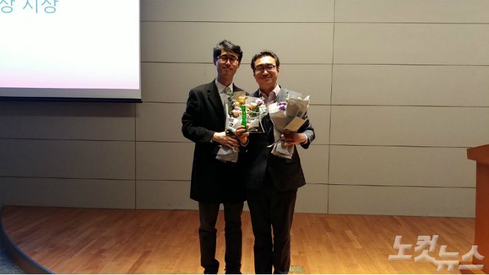 김동석 (사)토닥토닥 이사장(오른쪽)이 18일 대전충남인권연대가 정한 '풀뿌리 인권상'을 수상했다. 사진 왼쪽은 이상재 대전충남인권연대 사무국장. (사진=대전충남인권연대 제공)