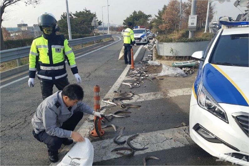 신고를 받은 경찰은 도로 1·2차선의 차량 통행을 막고 40여분 정도 도로 위에서 나뒹구는 장어 300여 마리를 수거했다.