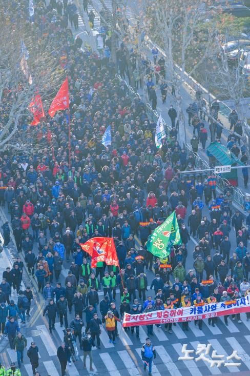 전국택시노조 등 택시 4개 단체 회원들이 20일 서울 여의도에서 열린 '카카오 카풀 반대 3차 집회'를 마친 뒤 마포대교로 행진하고 있다.