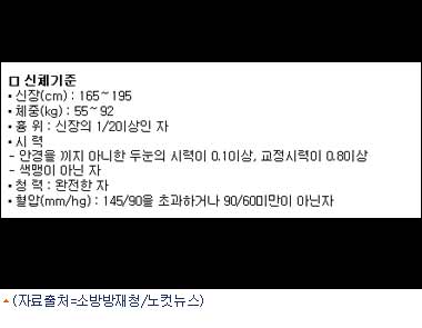 소방관은 남성의 경우 165cm이상, 57kg 이상이어야 하며 교정직과 소년보호직, 철도공안직 공무원 또한 키와 몸무게에 제한이 규정돼 있다.