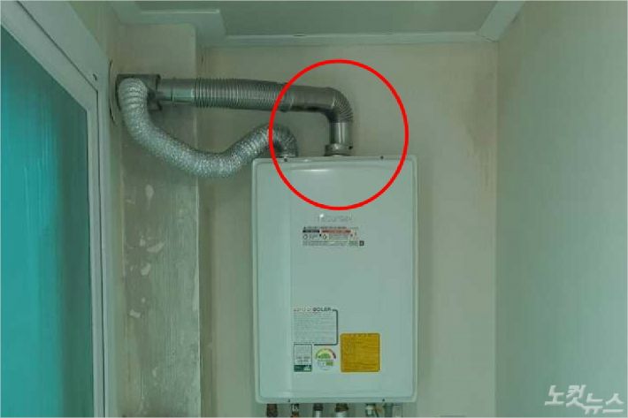 배기관이 가스보일러와 어긋나 있고, 급기관도 설치 매뉴얼과 달리 밑으로 처져 있다. (사진=강릉소방서 제공)