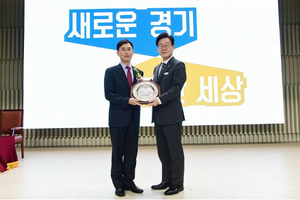 27일 명예퇴임한 김진흥 경기도 행정2부지사(사진 왼쪽)가 이재명 경기지사로부터 공로패를 받고 기념촬영을 하고있다.(사진=경기도청 제공)