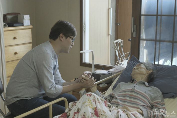 심용환 작가가 병상에 누워있는 문동환 목사의 손을 맞잡은 모습. (CBS TV 특집 다큐 '북간도의 십자가'' 스틸)