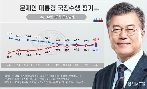 ◆ 이택수> 문재인 대통령의 마지막 국정 수행 평가가 긍정 45.9%. 1.2%포인트 하락했습니다. 부정 평가는 49.7%. 3.6%포인트 상승했는데요. 주중에는 부정 평가가 50%를 살짝 넘기도 했었는데 목요일, 금요일 좀 반등하면서 청와대 입장에서는 다행스러운 일일 거 같은데 49.7%로 40%대로 마감이 됐고 긍정 평가는 45.9%. 역대는 아니지만 취임 후에는 최저치를 기록했습니다. 1.2%포인트 빠졌는데요. 역시 경제 상황에 대한 부정적 인식이 계속되는 상황에서 김태우 전 수사관 관련된 보도가 굉장히 컸고요. 그다음에 여당 의원의 공항 갑질 논란 등이 악재로 작용한 것 같습니다.