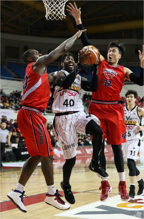 '죽어도 내가 넣을 거야' LG 센터 제임스 메이스(오른쪽)가 구랍 31일 열린 kt와 홈 경기에서 상대 겹수비에도 무리하게 슛을 시도하고 있다.(창원=KBL)