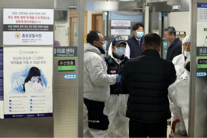 진료 상담을 받던 환자가 의사에게 흉기를 휘둘러 숨지게 한 서울의 한 대형병원에서 31일 경찰 과학수사대 대원들이 현장으로 들어가고 있다. (사진=연합뉴스 제공)