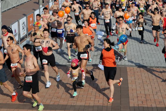 ◇ "추위쯤이야"…건강하게 새해를 맞는 사람들 이날 오전 11시 11분 11초 대전 갑천 엑스포다리에서는 윗옷을 벗은 3천여명의 맨몸 마라톤 참가자들은 영하로 떨어진 강추위에도 아랑곳하지 않고 차가운 강바람을 온몸으로 맞서며 뜻깊은 새해맞이 행사를 즐겼다.