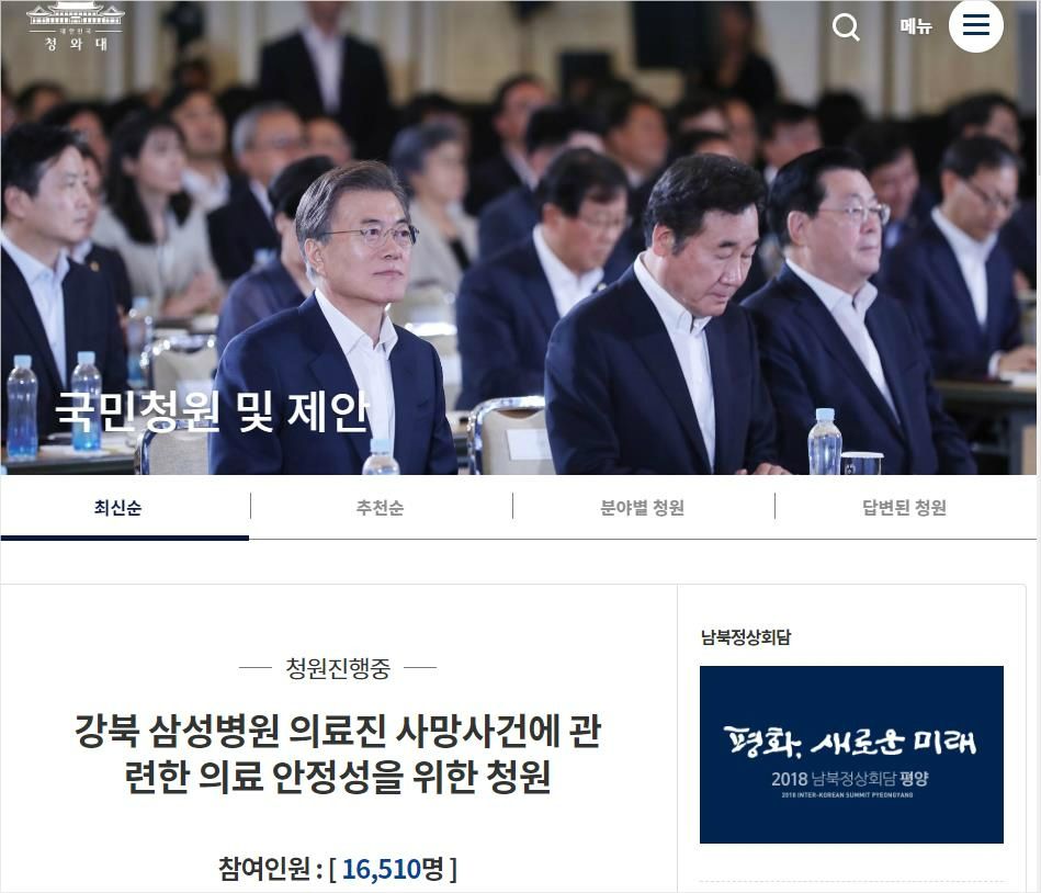 사건이 발생한 지난달 31일 청와대 청원 게시판에는 "강북삼성병원 의료진 사망사건에 관련한 의료 안정성을 위한 청원"이라는 제목의 청원이 올라왔다.