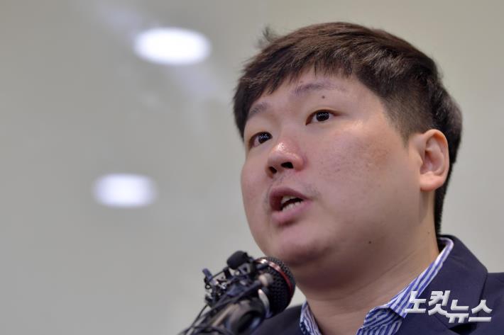 청와대가 KT&G 사장교체를 지시하는 등 부당한 압력을 가했다고 주장한 신재민 전 기획재정부 사무관이 2일 오후 서울 강남구 한 사무실에서 기자회견을 하고 있다.