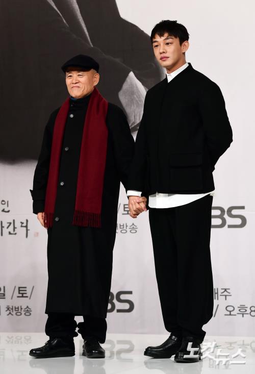 철학자 도올 김용옥과 배우 유아인이 3일 오후 서울 영등포구 타임스퀘어에서 열린 KBS1 지식 버라이어티쇼 ‘도올아인 오방간다’ 제작발표회에 참석해 포즈를 취하고 있다.