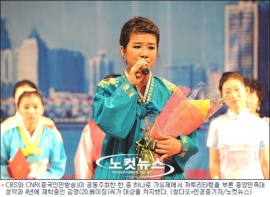 올해 처음 열리는 이번 행사에서 영예의 대상은 우리 민요 까투리타령을 부른 중앙민족대 성악과 4년에 재학중인 김영(20.베이징)씨가 차지해 부상으로 세정 그랜드 피아노(시가 1300만원)를 받았다.