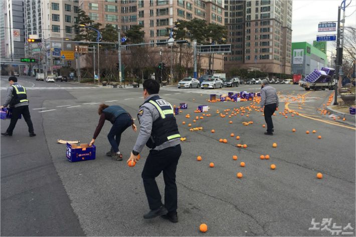 부산의 한 도로 위에 오렌지 담긴 상자 20개 쏟아져 15분 통행 통제