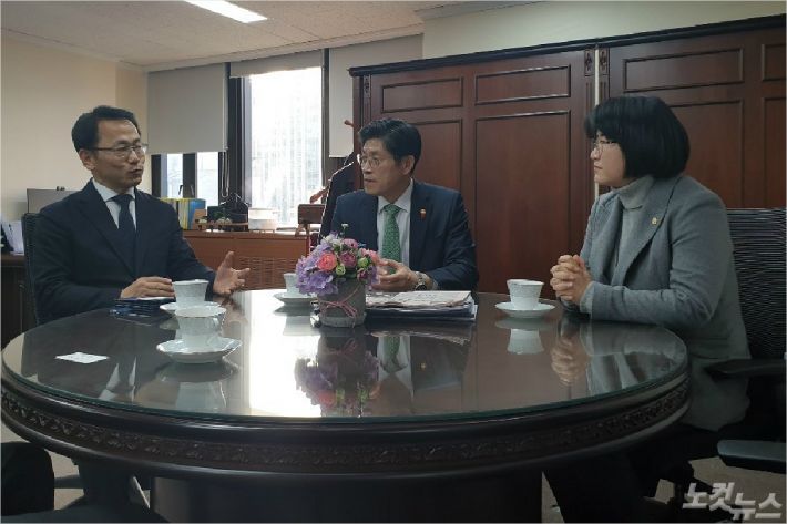 민주당 경북도당 허대만 위원장이 정부부처를 찾아 영일만대교 건설의 당위성을 설명하고 있다(사진=민주당 포항남울릉지역위원회 제공)