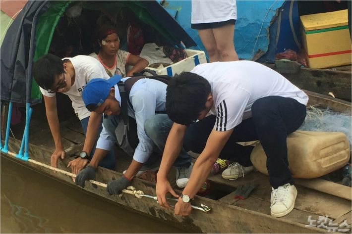 건양대 학생들이 보트에서 고기를 잡는 캄보디아 현지 주민을 위해 햇빛을 차단하는 그늘막을 설치해주고 있다. (사진=자료사진)