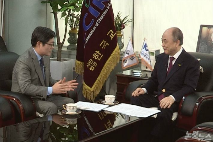 한국교회연합 권태진 대표회장(우측)이 CBS TV 뉴스 인터뷰를 하고 있는 모습.