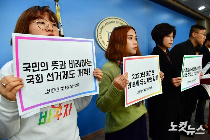 바른미래당 김수민 의원과 6개 정당 청년위원회(바른미래당, 민주평화당, 정의당, 민중당, 녹색당, 우리미래)의 ‘선거개혁 청년· 청소년행동’이 28일 오전 국회 정론관에서 '청년.청소년 정치참여를 위한, 선거개혁 집중행동 선포' 기자회견을 하고 있다.