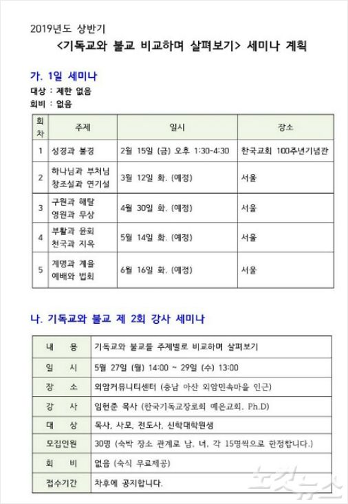 세미나는 강사인 임헌준 목사가 1강 '성경과 불경 그 편찬과 권위', 2강 '왜곡과 오해 바로잡기'를 주제로 강의를 한 뒤 참석자들과 질의 응답을 하는 순으로 진행된다.