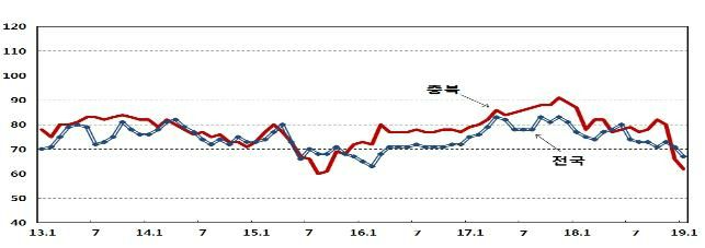 한국은행 충북본부는 30일 1월 충북지역 기업경기 실사지수 즉 BSI가 62로 전달보다 4p 하락했다고 밝혔다.