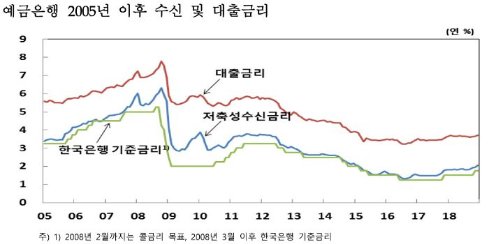 31일 한국은행이 발표한 '2018년 12월중 금융기관 가중평균금리'에 따르면 지난달 예금은행의 신규취급액기준 저축성수신금리는 연 2.05%로 전월대비 0.09%포인트 올랐다. 반면 대출금리는 연 3.72%로 전월대비 0.06%포인트 오르는 데 그쳤다.