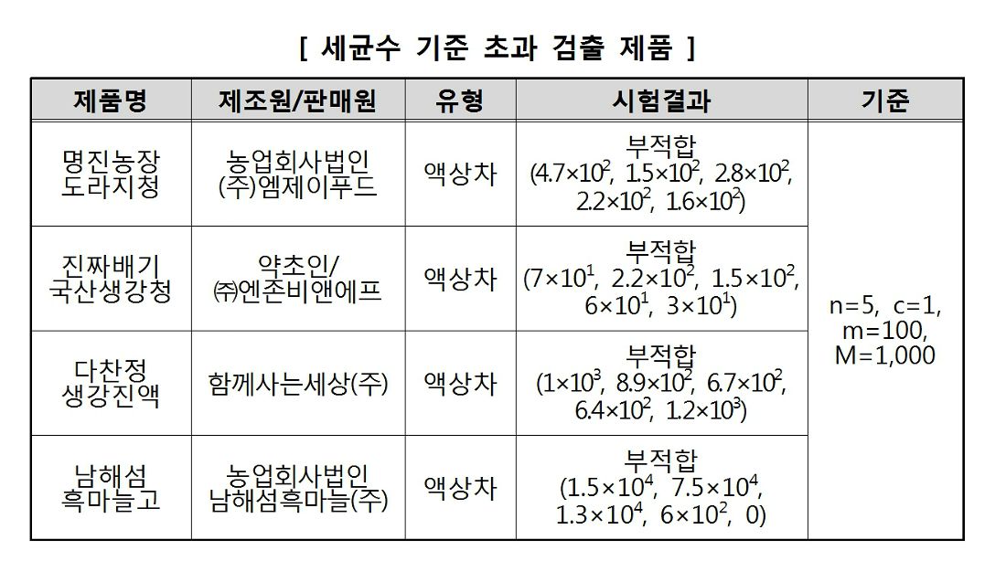 조사대상 25개 중 4개 제품은 세균수가 기준을 초과(150~75,000 CFU/g)해 검출됐다.