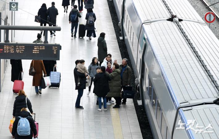 설연휴 마지막날인 6일 오후 서울역에서 배웅 나온 가족들이 할머니 할아버지를 배웅하고 있다.
